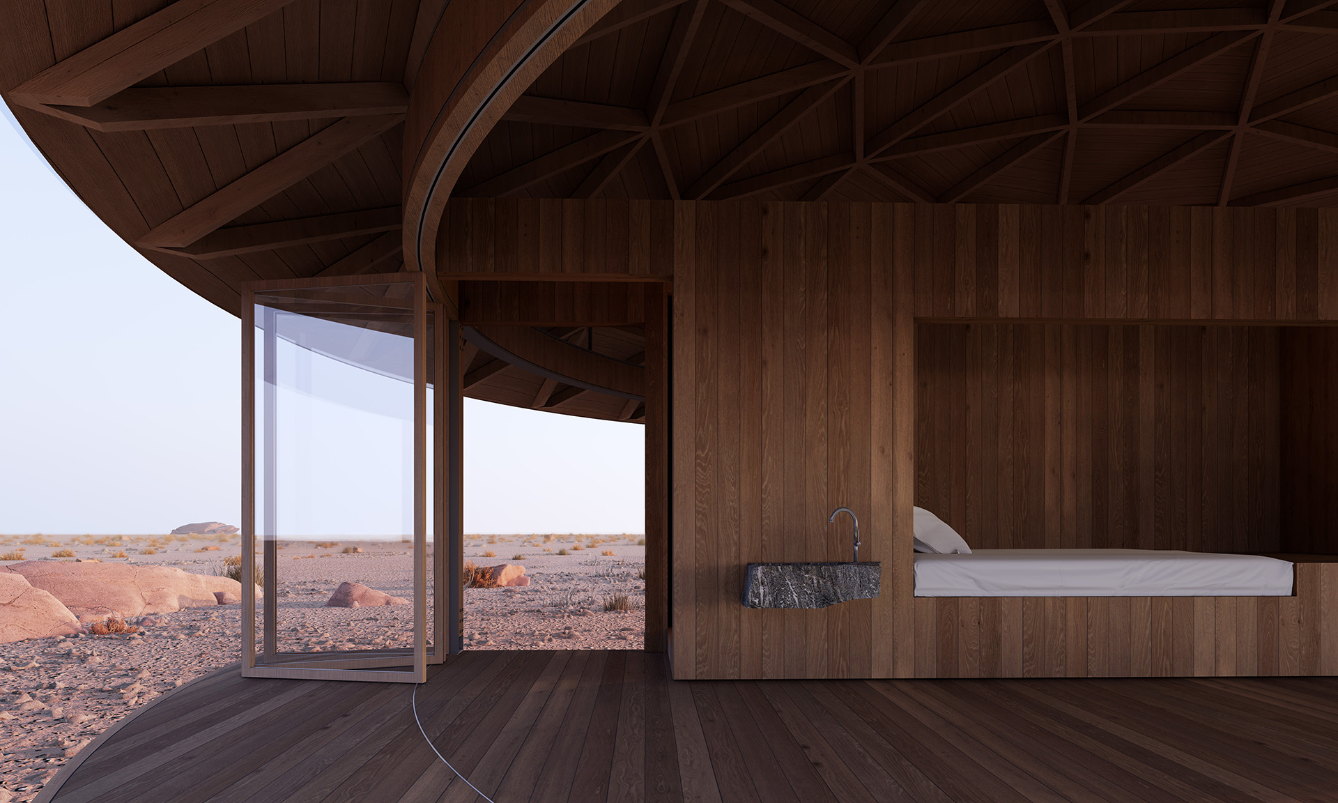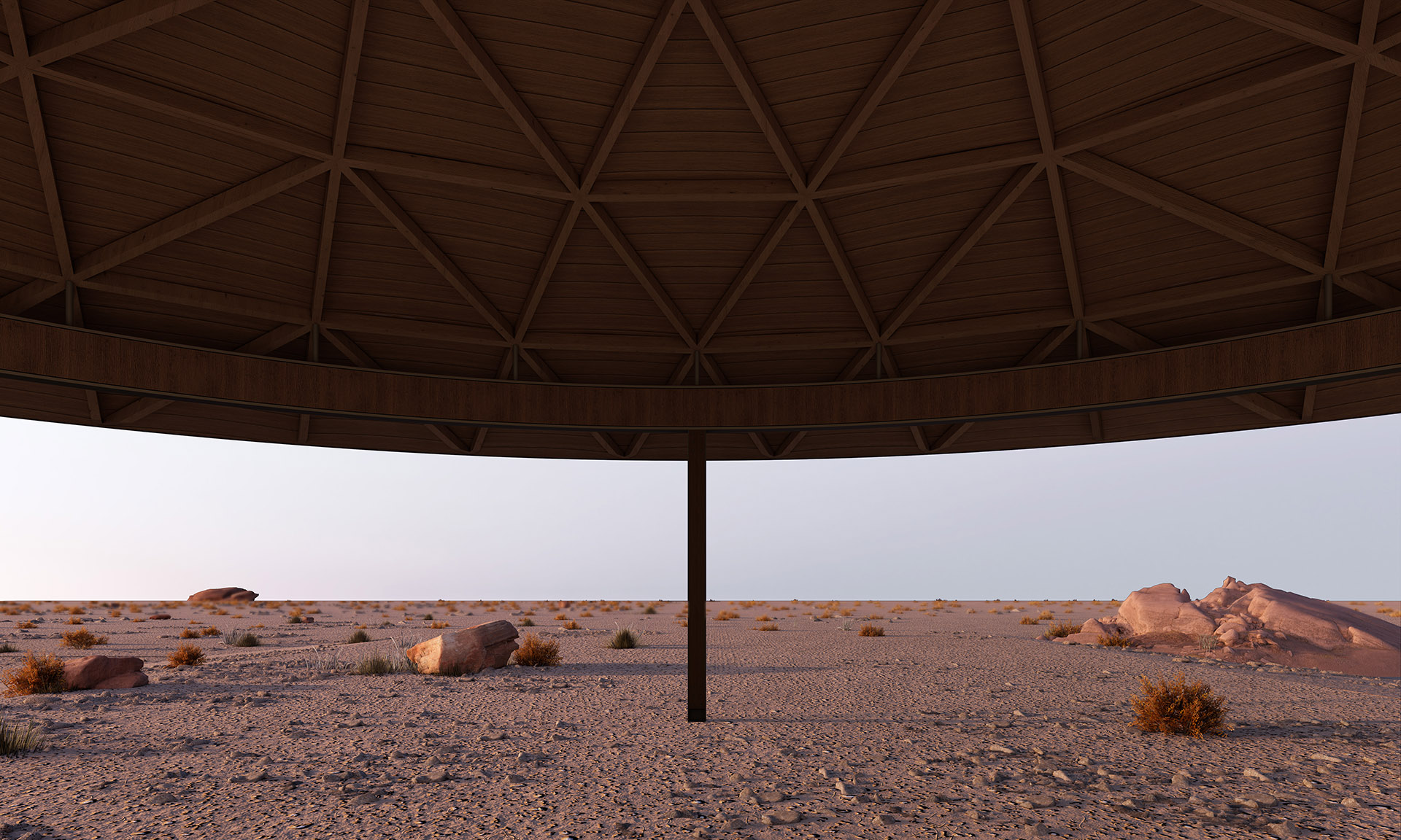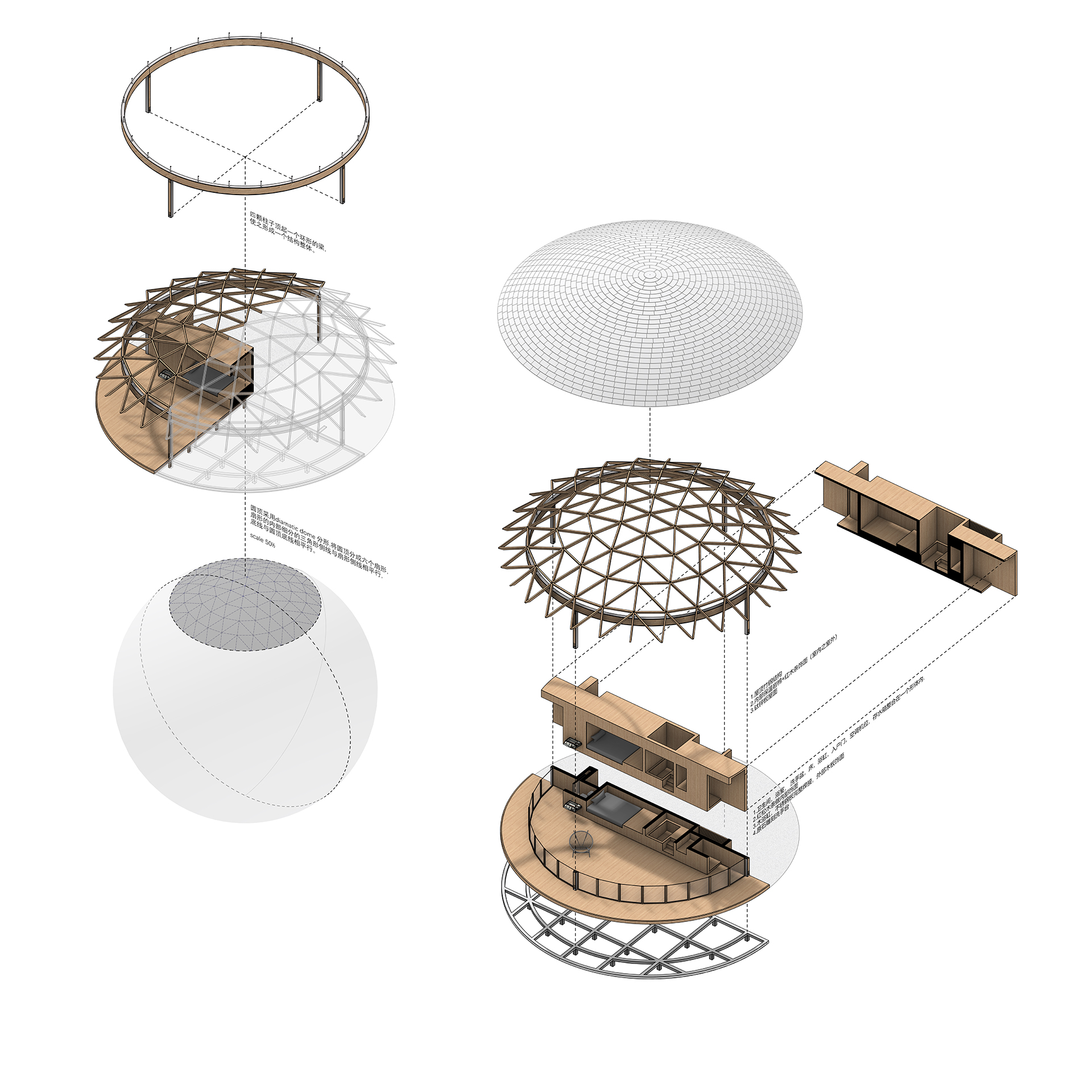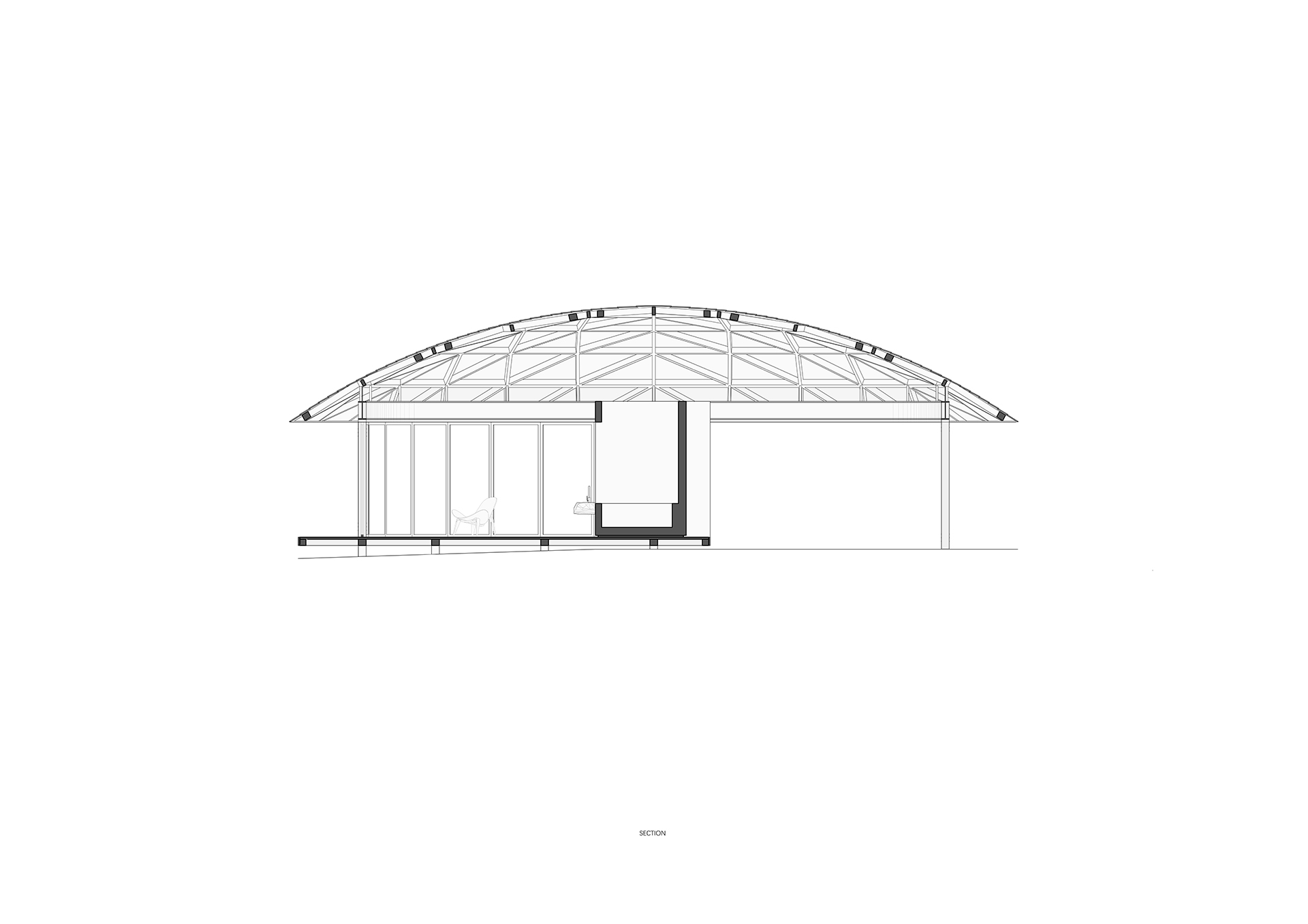 “半圆”有一个特殊的几何特征,既是他包含一个直线和一个弧线。功能性元素在直线所产生的厚度内完成,而由直线所分割出的两个弧线端产生了两个“半圆”空间:室内与室外。空间顶部是一个球缺(Spherical cap),由四棵钢柱支撑,球缺的结构是由diamatic dome分形转化而来,他的优势是使得圆顶结构与梁柱结构很适应的结合。两个半圆空间分别是静止和运动,充实与虚空,重量与轻盈等互为矛盾,而矛盾又在一个球缺下被统一。