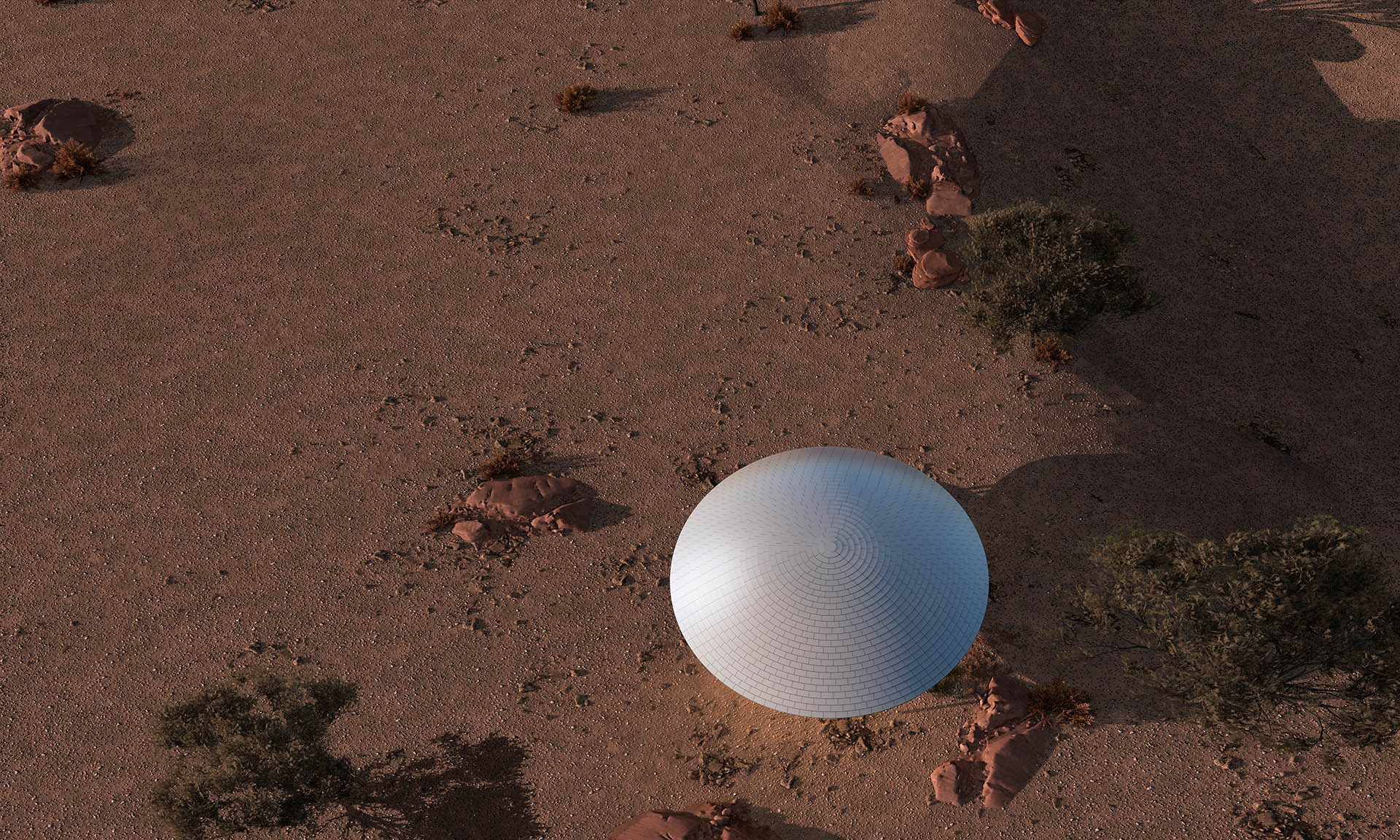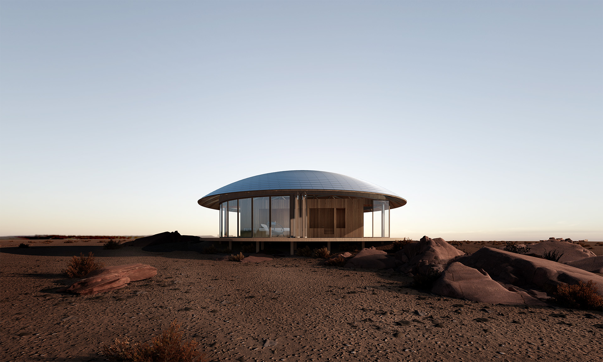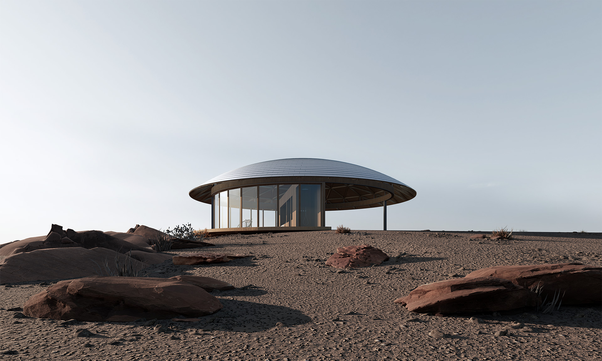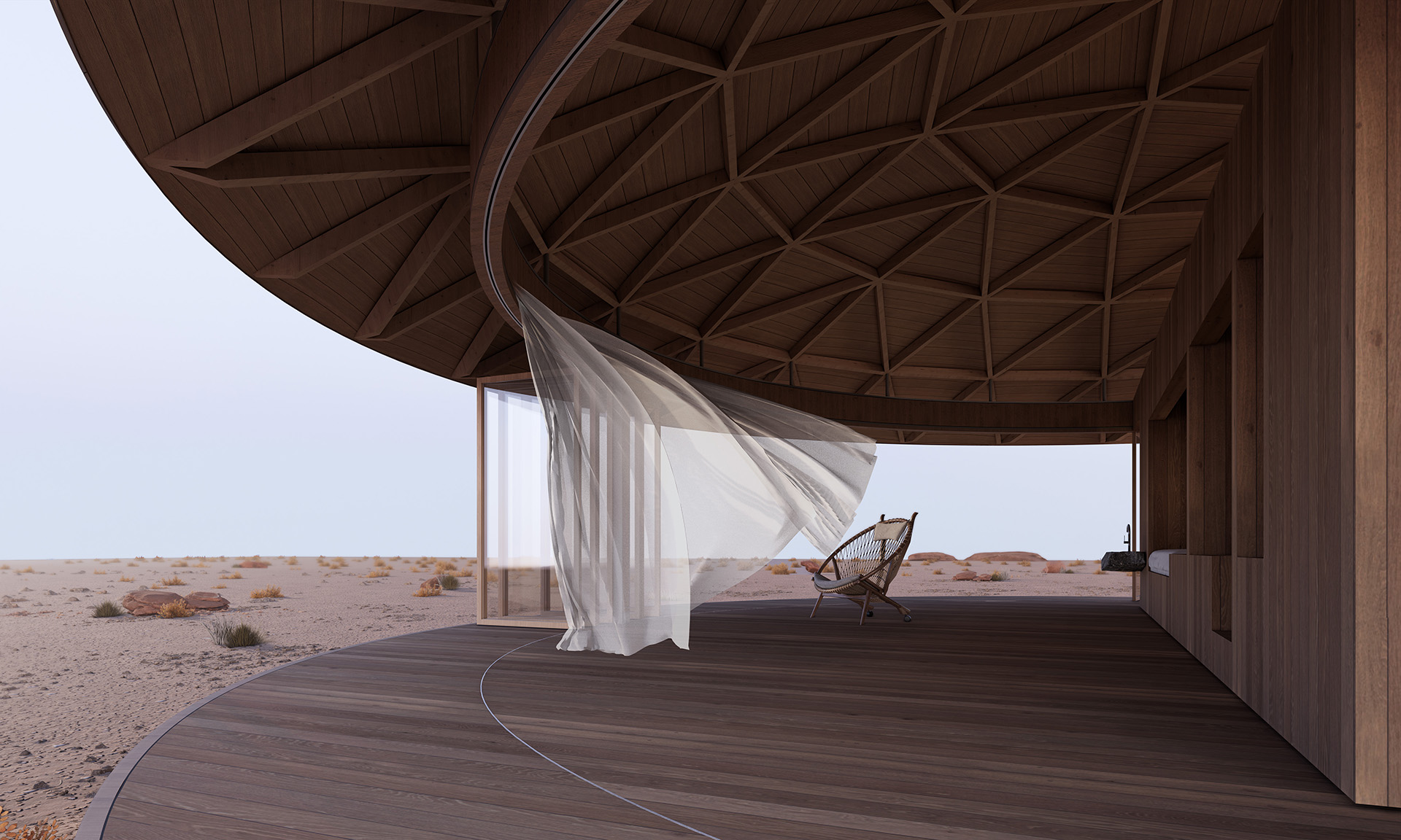 “半圆”有一个特殊的几何特征,既是他包含一个直线和一个弧线。功能性元素在直线所产生的厚度内完成,而由直线所分割出的两个弧线端产生了两个“半圆”空间:室内与室外。空间顶部是一个球缺(Spherical cap),由四棵钢柱支撑,球缺的结构是由diamatic dome分形转化而来,他的优势是使得圆顶结构与梁柱结构很适应的结合。两个半圆空间分别是静止和运动,充实与虚空,重量与轻盈等互为矛盾,而矛盾又在一个球缺下被统一。