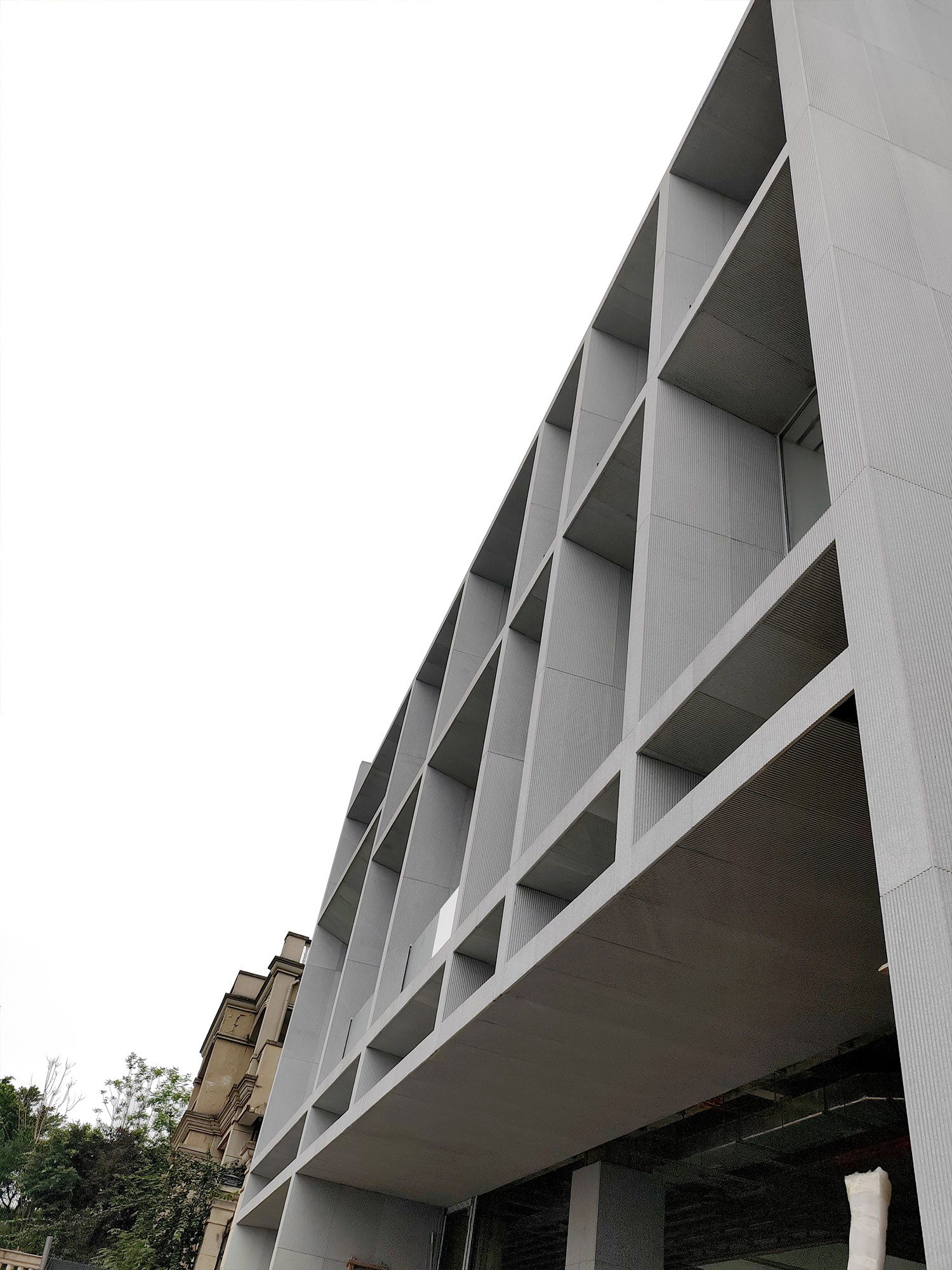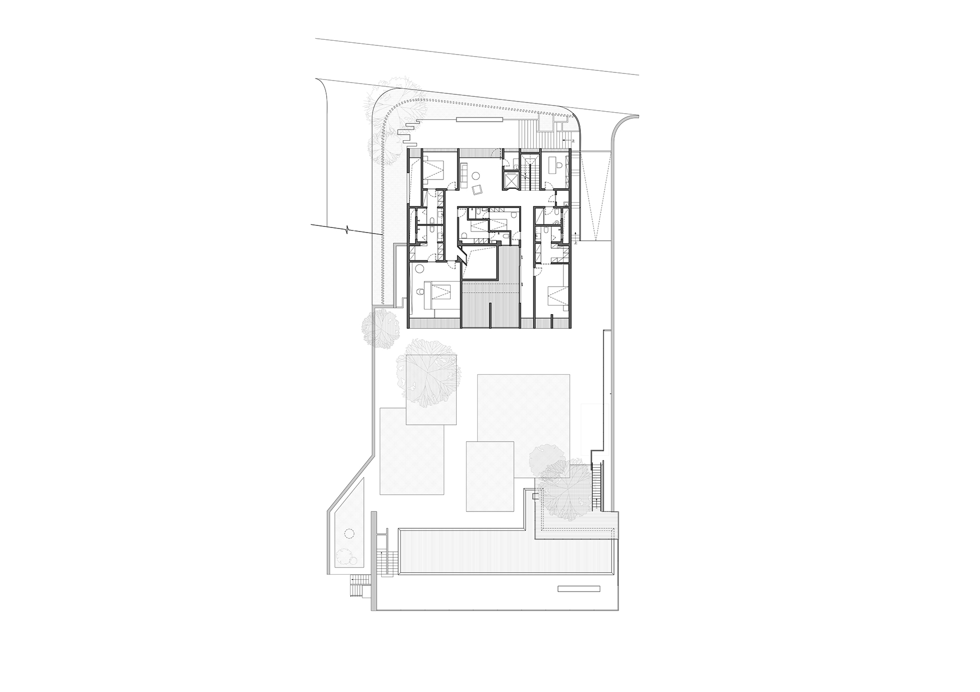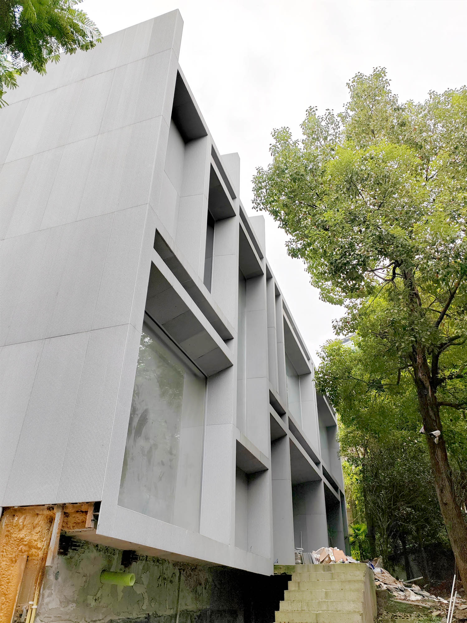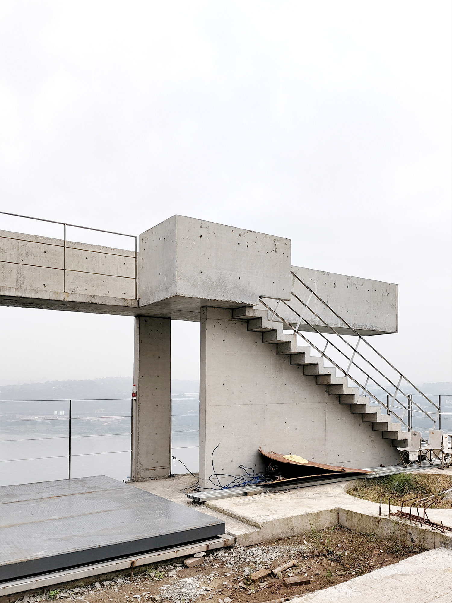 这原本是一个“中式想象的欧式”建筑,为什么说是想象呢?因为欧洲从未有这样的建筑样式存在。这是在特定时期一种用廉价创造奢华的造梦方法。但是他地处长江边,高悬于山腰之上,无限的风景环绕。经过长时间的讨论,业主终于下定决心将其进行一个脱胎换骨的改造,将一个“欧式”建筑改造成为贴合生活本质的真实建筑。改造后的空间更加开阔。玻璃窗将长江和远山引入室内,天井让自然光线抵达到房间的进深处,一改原本由于单侧采光所产生的幽暗。花园是漂浮起来的草坪,相互叠加,在叠加的边缘安置了照明路径的光线。泳池的水蔓出了边界,像一面镜子,在视觉上连接到了长江。围墙原本低矮,院子内部几乎能被肆意的窥探。于是将结构柱升高,清水混凝土除了填充部分墙面,还在柱子顶部搭建了一个更加适合远眺的平台。底部仍有大量空间可以被使用,于是便有了果园,球场,鱼池,动物园......