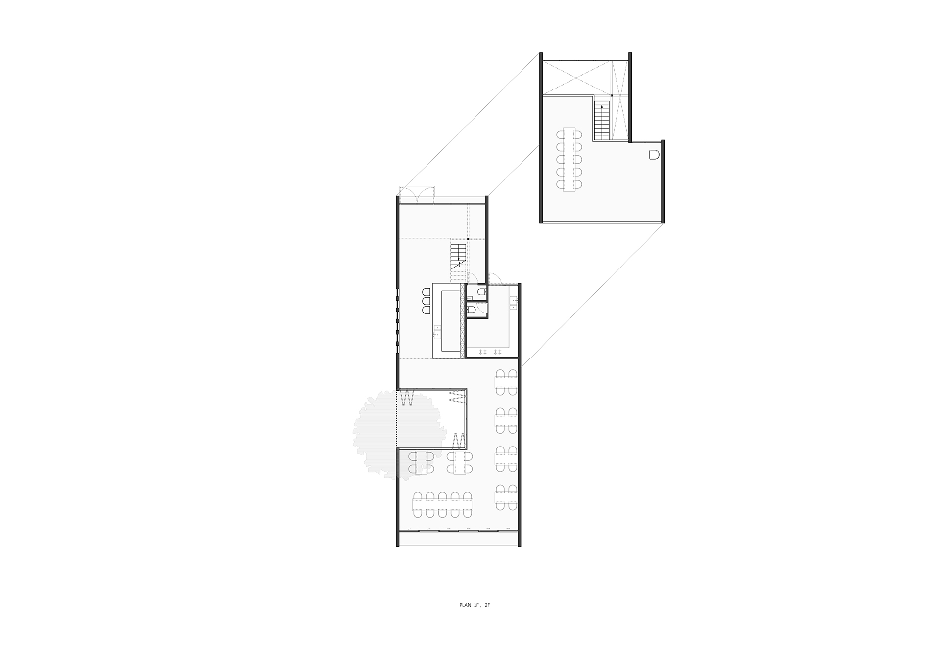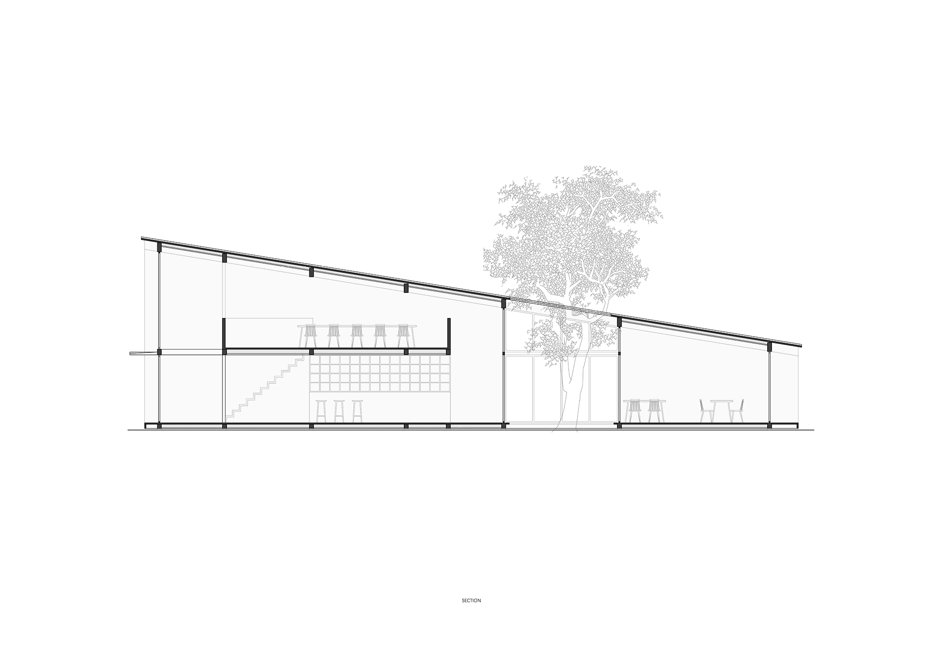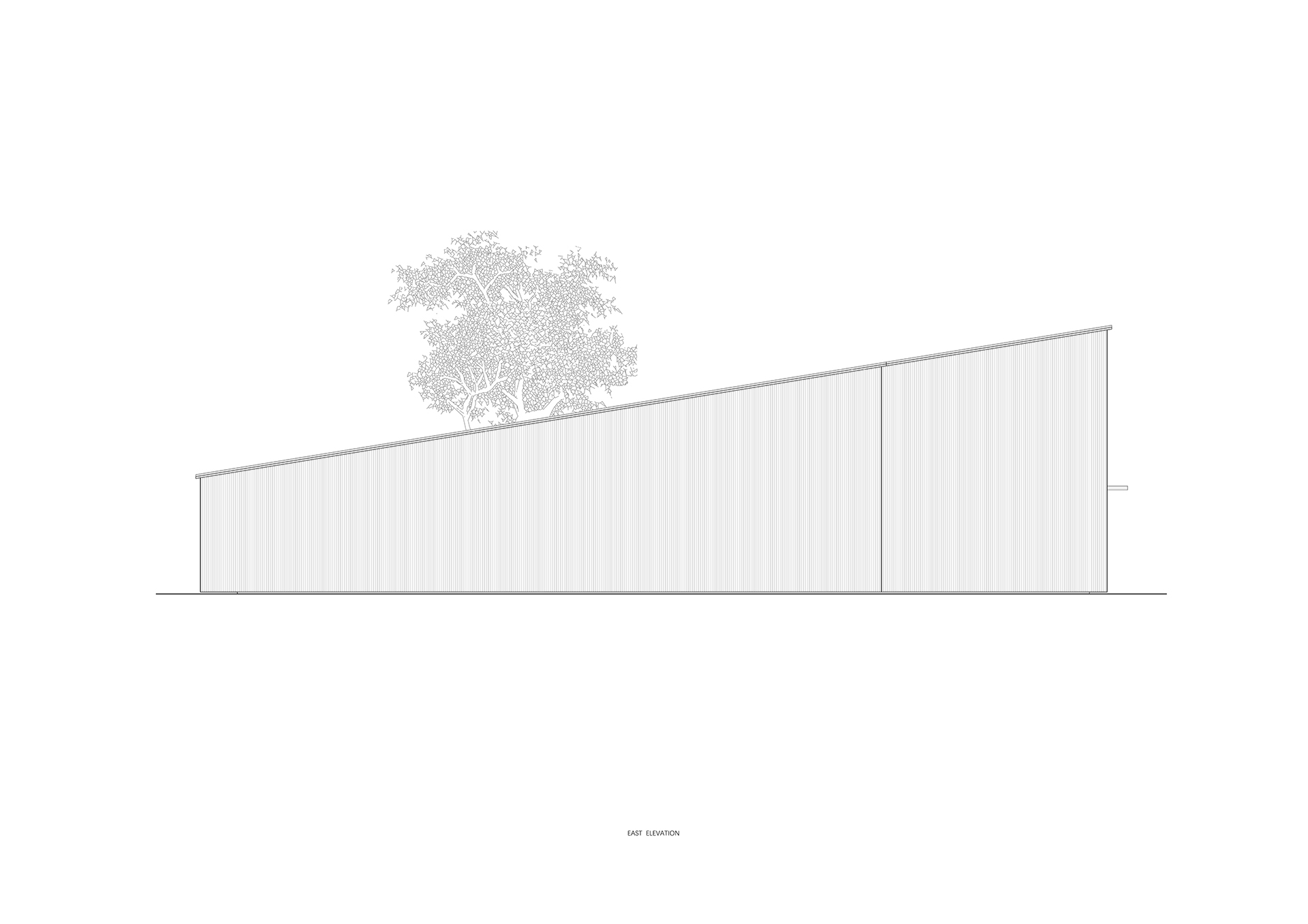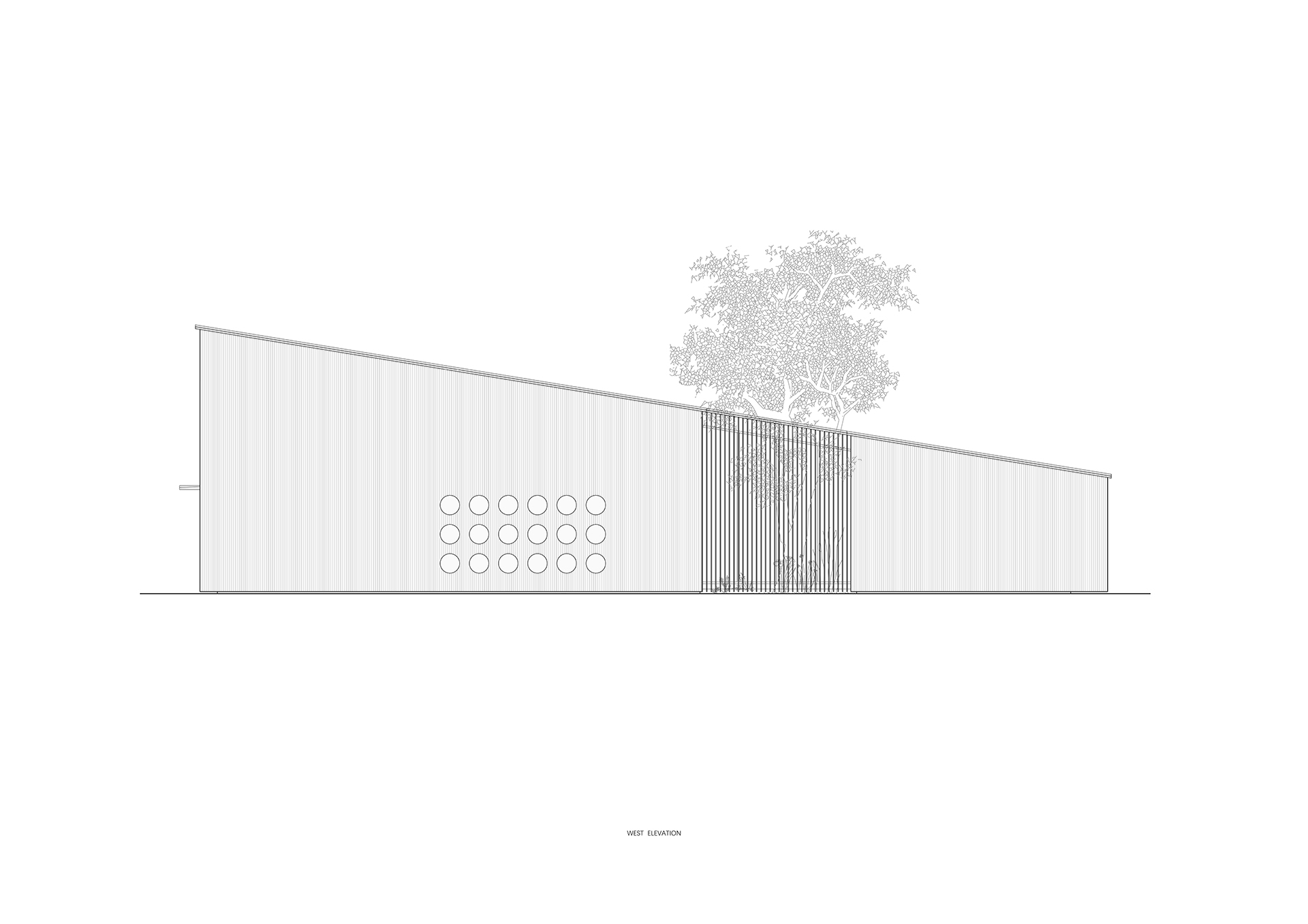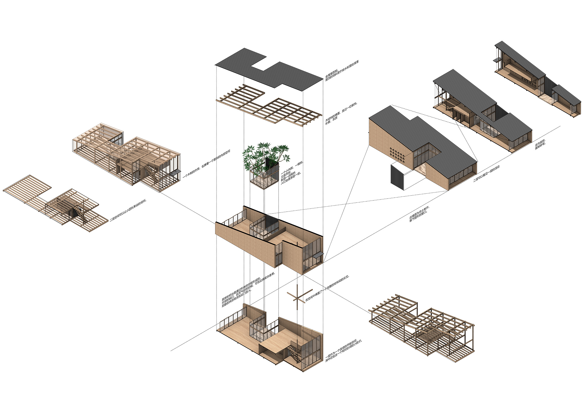 永无乡是一个民宿集群,他们以不同形式散落在村子民房之间。这个建筑位于村口,是为住客提供登记,就餐,聚会的场所。一个将低矮与高耸,平铺与叠加,内缺与外缺等相互矛盾的关系整合在一起的建筑,而这一切是通过一个倾斜屋面完成的。建筑平面整体呈现为长方形,连贯两端的路径被内缺的庭院中断,引入的是一个正方体的自然,阳光,流动的空气。 “外缺”是为厨房提供的一个后勤动线。坡顶的高处是一个开敞的茶室,这里也会组织课程或会议。沿着道路的立面除了有一组圆形玻璃窗外,其余部分都是封闭的,因为道路上常有村民在劳作,这样的边界处理,最大程度的避免对村民生活的打扰。