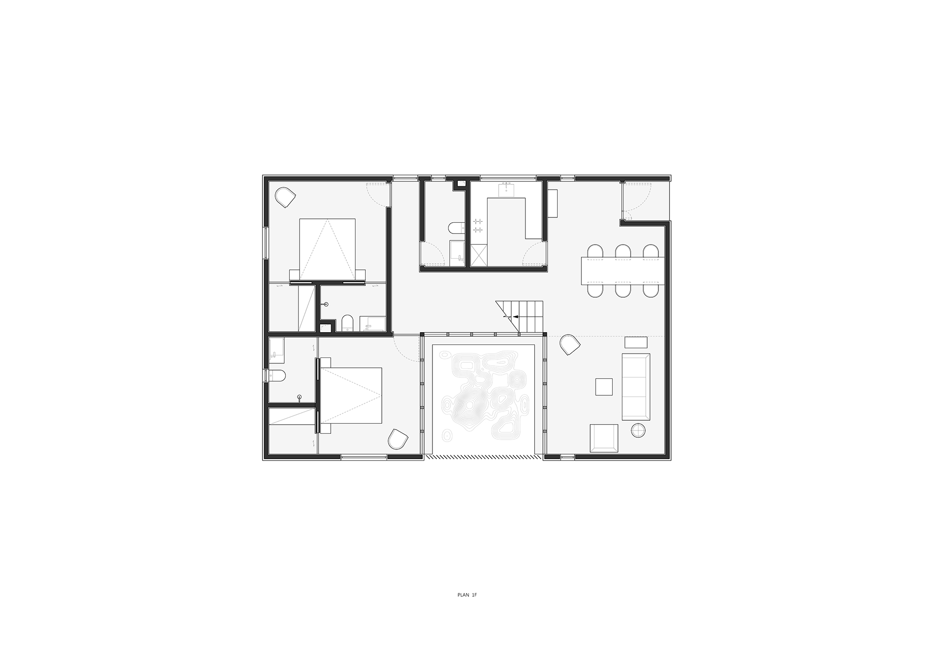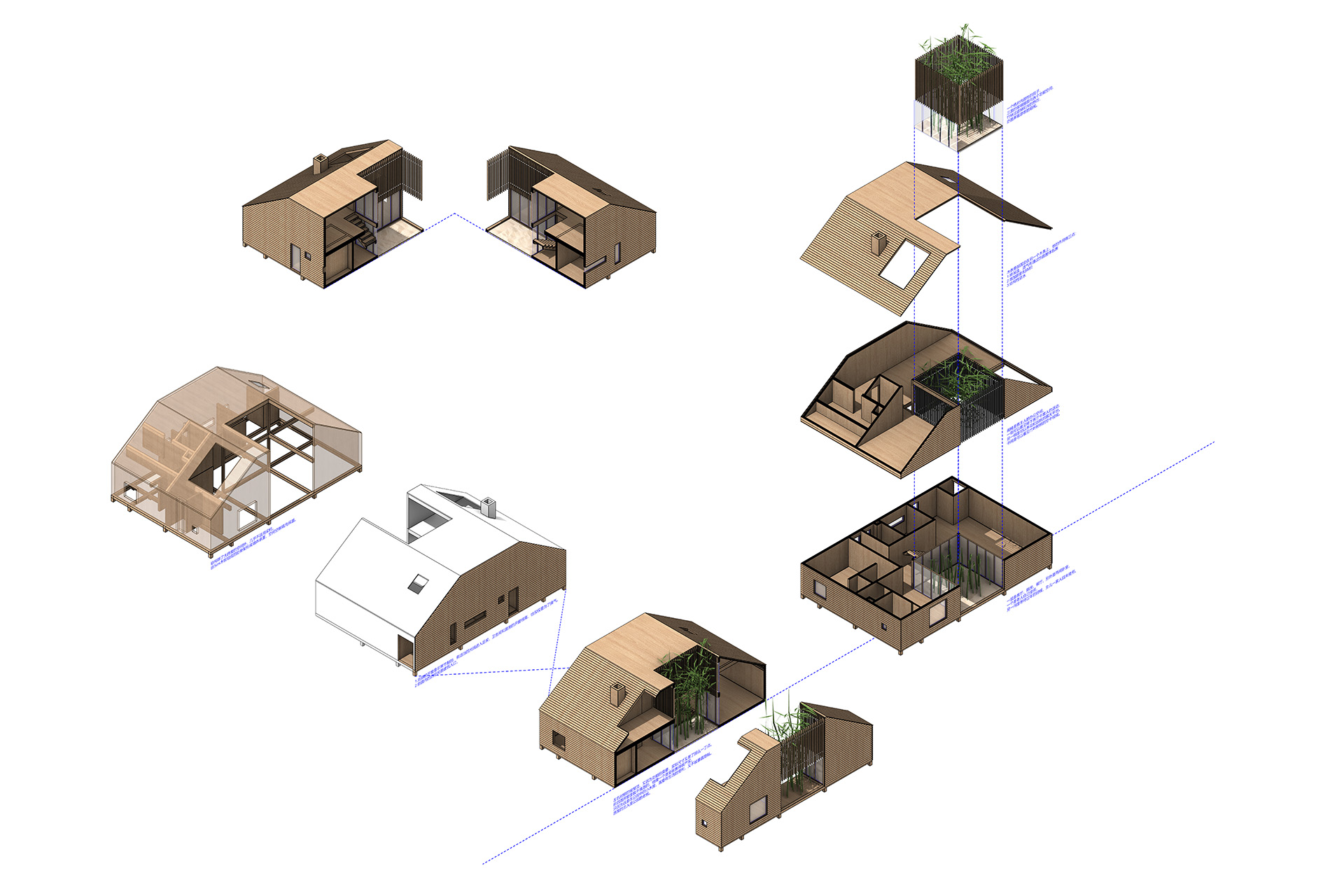 一位长辈在经营一座1200亩的花海景区。他喜欢景区内的一片竹林。便计划在竹林的南侧建一个房子,用于家庭居住。为了避免游客不相干的窥视,大部分的窗户是朝向内院的。建筑是将一个房子原型进行了90°的旋转,山墙被拉伸并成为建筑的主立面,这样做的好处是将坡顶空间很容易被使用。由于功能的适应性,原本的对称性被内部功能轻微打破,反映出秩序与真实之间脆弱的平衡。生活中稍有留意,对称的秩序总是在被真实偷偷的篡改。人们的用手习惯,使左右胳膊发生微弱的粗细不一致;人们咀嚼习惯,使左右脸颊肌肉发育不再均衡......绝对的对称是“真实的缺失”,兼顾真实的对称则带来更大的秩序张力。