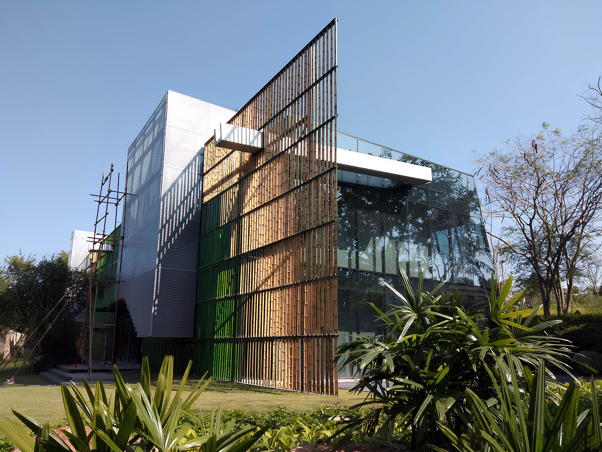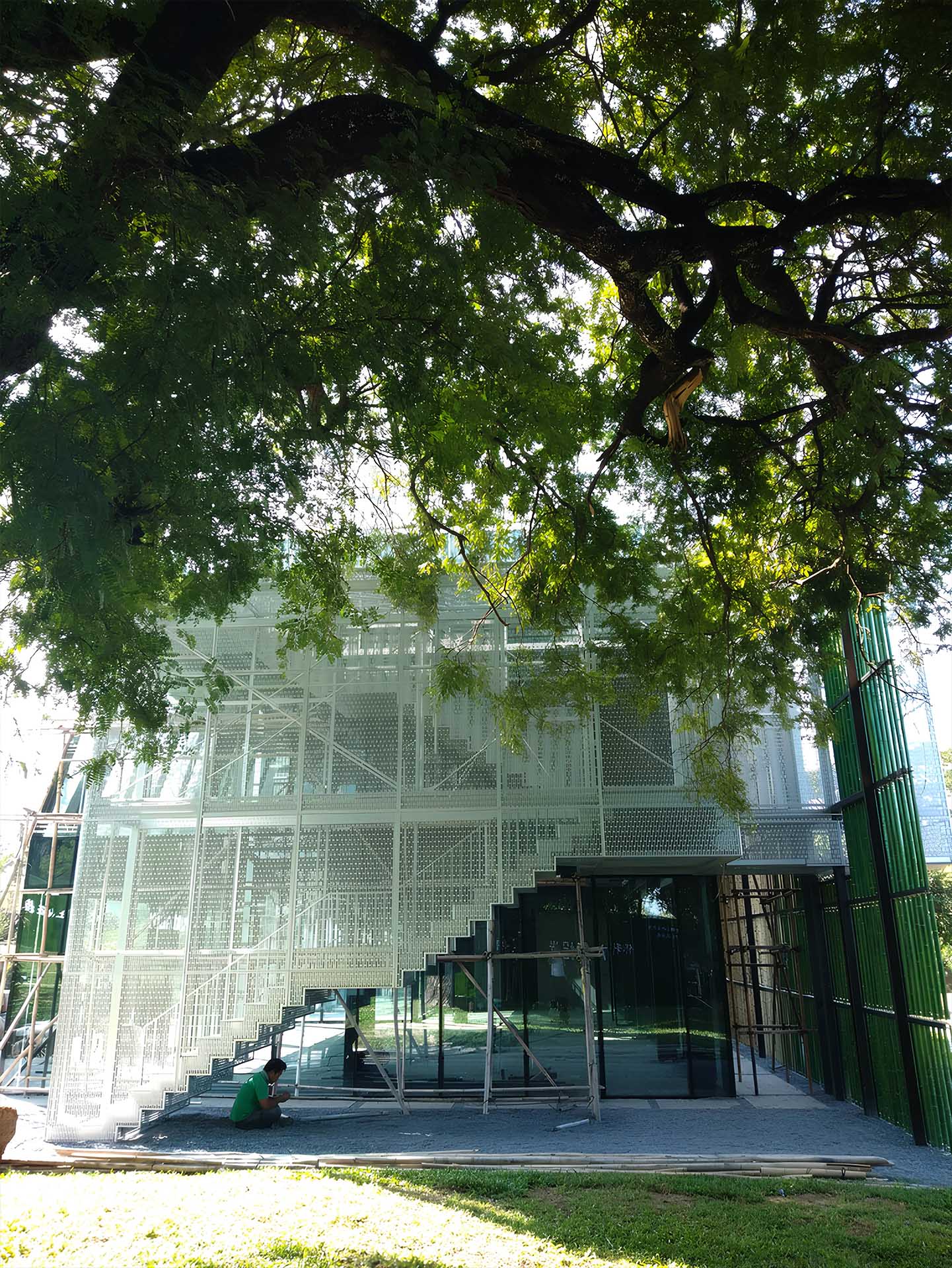 中国最密集的奢华酒店聚集地必是三亚海棠湾,仅仅一条马路之隔,竟然遗落着一个历史村落,这里植被繁茂,房子是珊瑚石建造的,只需稍微的仰望,就会看见树梢上如海市蜃楼般的现代酒店建筑群。在这里保利为世界书局建了一个可以阅读,就餐的建筑。在这样优美的自然环境下,任何一个巨大体量的置入都是对环境极其粗鲁的入侵。为了让这个“不得不”的建筑一方面融入环境,另一方面又能保持其自身存在,唯一的方式就是主动的“自我消失”。建筑是一个可以被任意开敞的玻璃盒子,它在反射周边的绿色,即使在高出树梢的顶部,也将玻璃进行一定角度的倾斜处理,它在反射天空,融入天空。竹子是一个常常被设计师青睐的材料,但往往停留在其枯萎,干燥,泛黄的状态下,但另一个事实是,在新鲜的竹子被劈开的瞬间,内腔呈现的黄色和外皮呈现的绿色相映成趣。设计师和工匠一起尝试了很多办法,最终保持住这样的色彩状态,南侧广场的立面,就是用这个竹子材料编织而成的。将这个竹片均匀的排列在钢架上,竹片两端有可旋转的固定件,竹子可以任意的调整使其呈现绿色或者黄色,最终通过秩序化的旋转,几千棵竹片共同呈现出一个动态感的图案。身体的移动伴随着视角的变化,使由竹片旋转组成的立面形态整体渐变,在自然树木的背景下,这个立面消隐了建筑的体量,却增强了建筑的存在,同时,这个表皮的另一个作用是过滤掉南侧带来的阳光炙烤,表皮和建筑的玻璃立面保持着可以通行的距离,人们穿行在忽明忽暗的光影之间。常常被忽视的交通空间,排水口充满锋芒的突破表皮,在表皮背景与阳光的衬托下显得过于闪亮。它是如此的被人喜爱,曾经被很多恋人选为结婚照的拍摄地,在其还未完全竣工的时候,巴基斯坦总理肖卡特·阿齐兹首选在此做了新书《From Banking to the Thorny World of Politics》的发布。