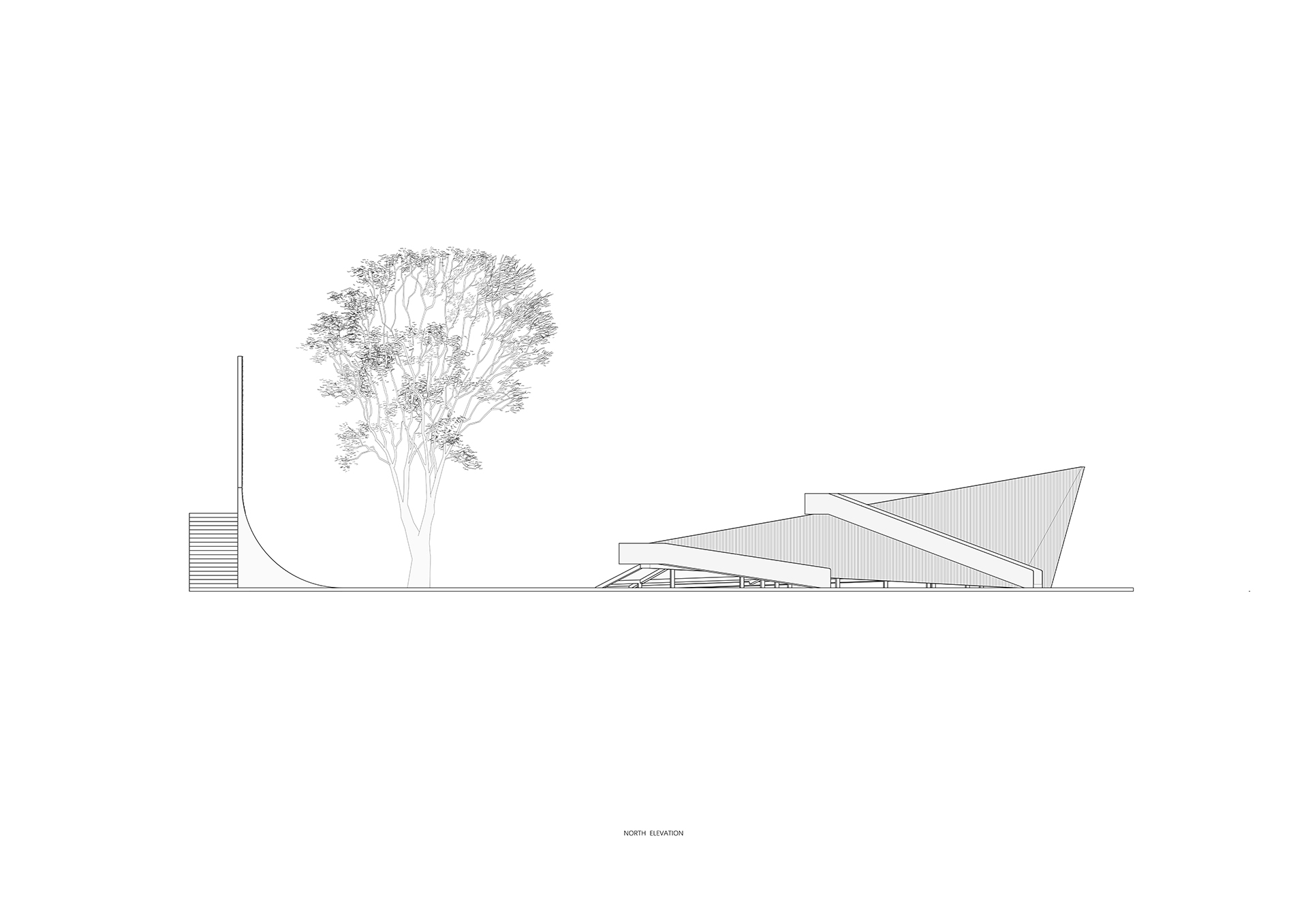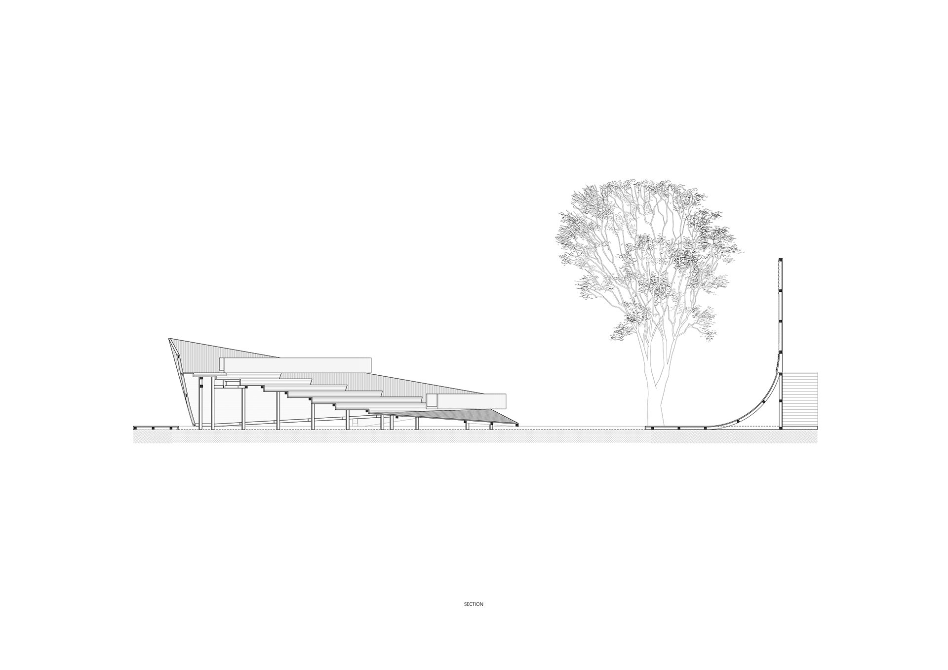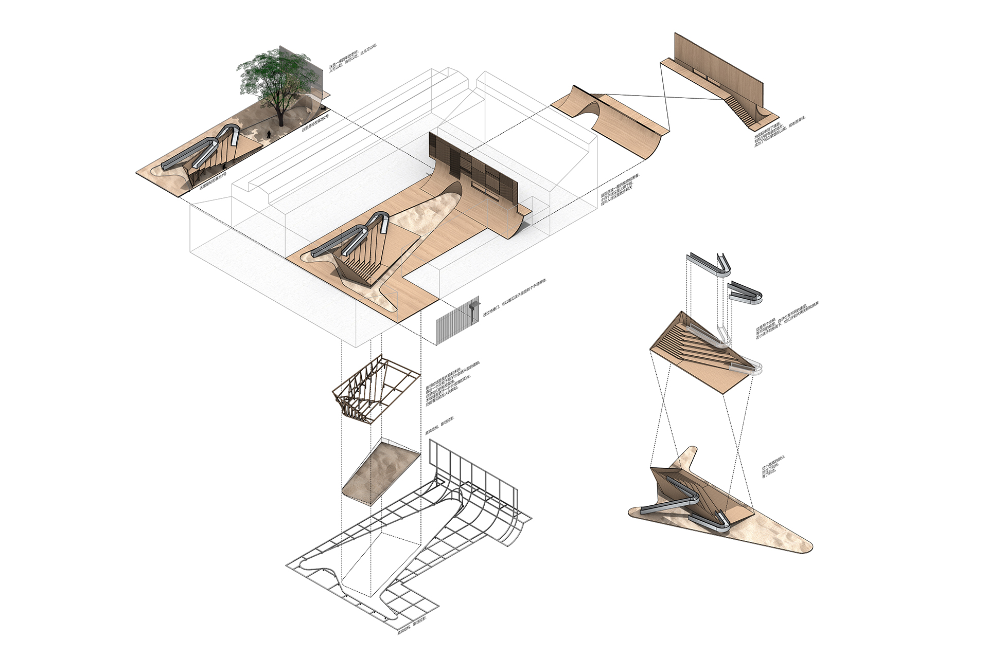 798 cube美术馆的院子是被红门画廊和塞尔维亚文化交流中心的建筑围合形成。院子连接美术馆的多功能厅。在这个院子里将会组织室外的演奏会,电影,或者公教部门的教学活动等。院子中央是一个由竹钢搭建起来的剧场。剧场的看台对成人并不算高,但对于儿童来说就有些吃力,所以剧场看台在不同的高度向下延伸出两个坡道用于通行,当然也可以成为儿童游戏的滑梯。剧场的内部是一个空腔,有一侧被微微翘起,空腔内部是排列整齐的结构,木板的缝隙带来一些光线,底部是松软的沙坑,这是小孩子最渴望的秘密基地的样子。院子中央有一颗百年的枣树,是从山东移栽过来的,裸露的院子因为有了这树荫便生动起来。地面和墙面是通过一个曲面联系在一起,卷曲起来的墙面和其背后的建筑保持着人可以穿行的距离。顺着这被分离开的廊道,孩子们在这里相互追赶。