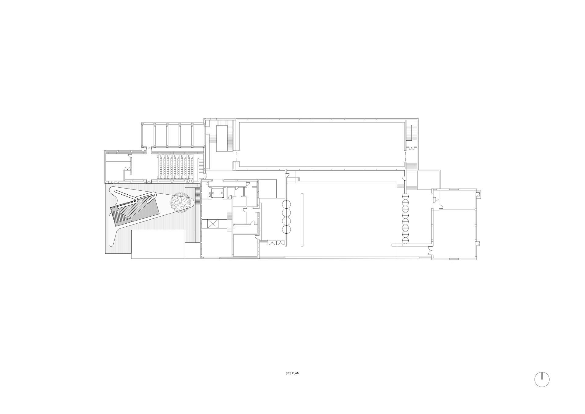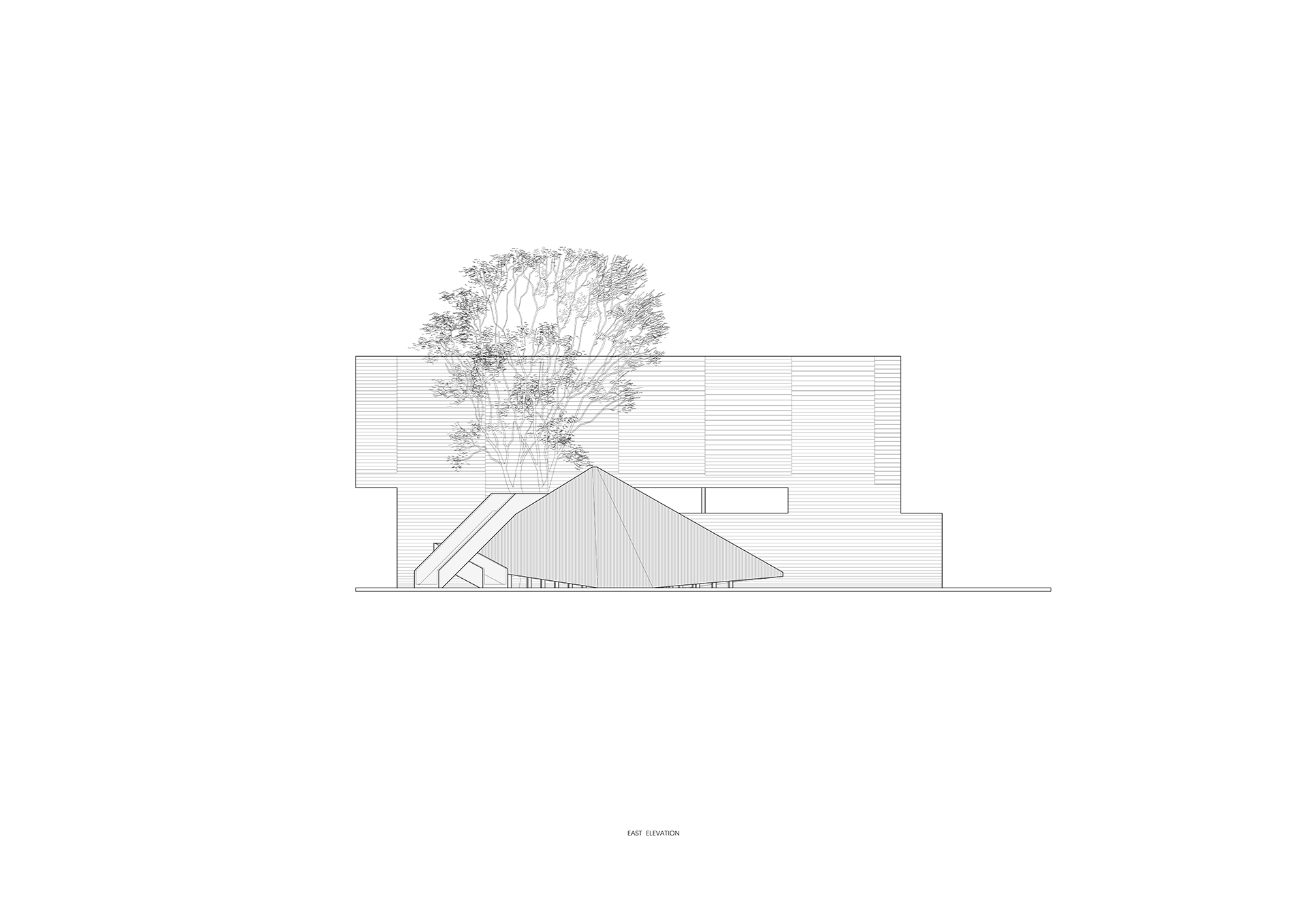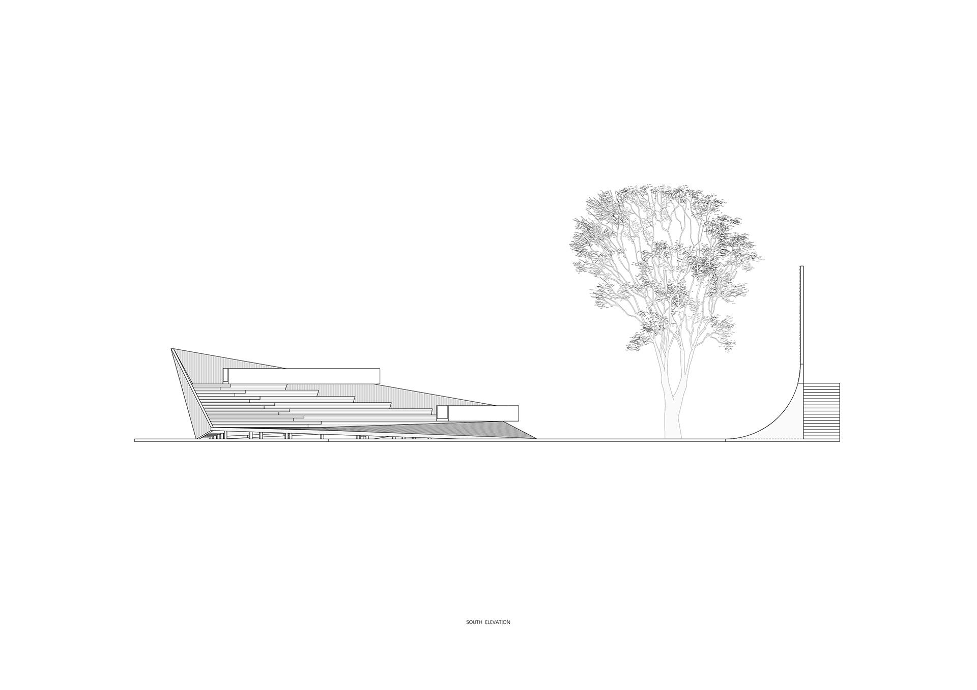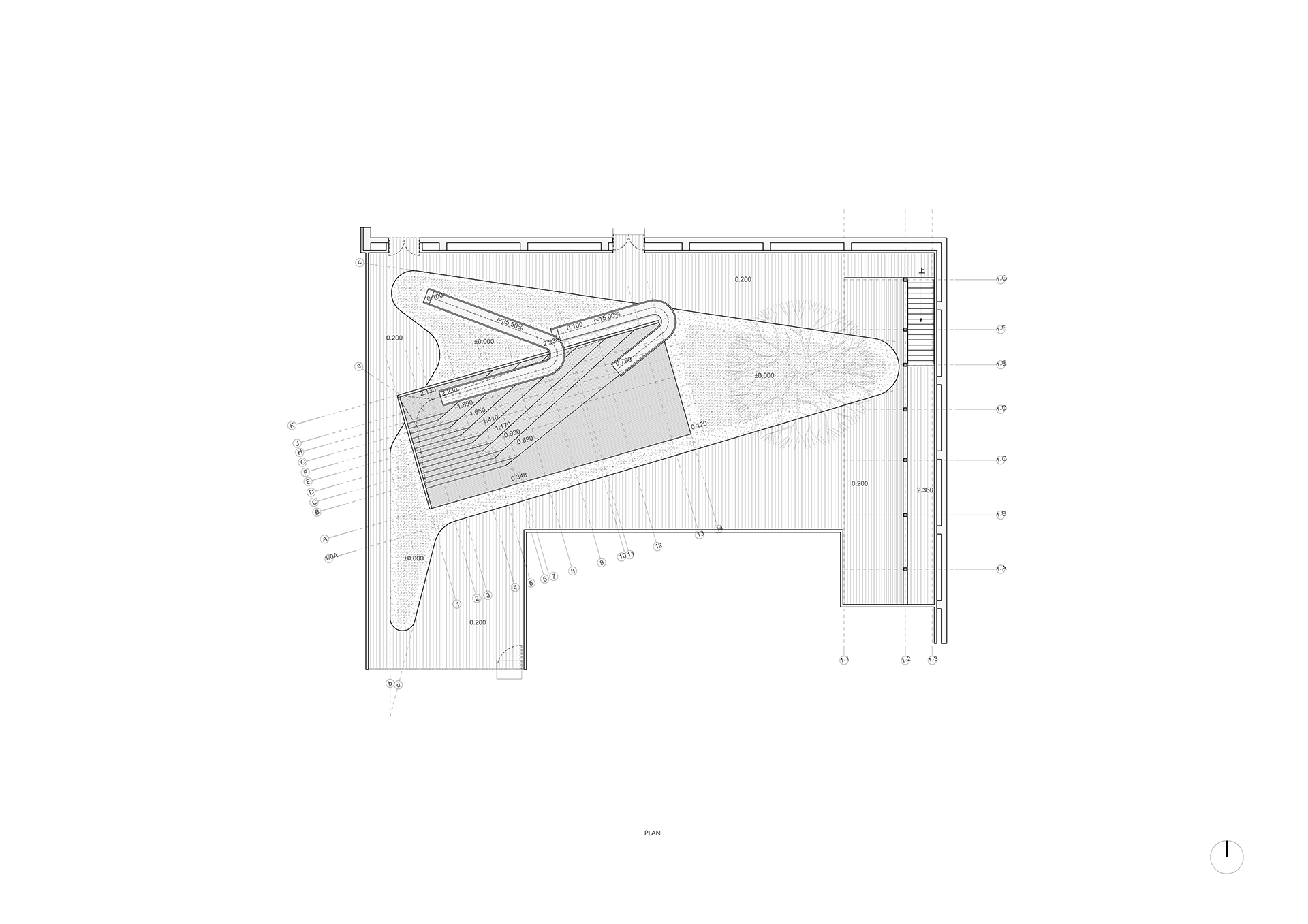 798 cube美术馆的院子是被红门画廊和塞尔维亚文化交流中心的建筑围合形成。院子连接美术馆的多功能厅。在这个院子里将会组织室外的演奏会,电影,或者公教部门的教学活动等。院子中央是一个由竹钢搭建起来的剧场。剧场的看台对成人并不算高,但对于儿童来说就有些吃力,所以剧场看台在不同的高度向下延伸出两个坡道用于通行,当然也可以成为儿童游戏的滑梯。剧场的内部是一个空腔,有一侧被微微翘起,空腔内部是排列整齐的结构,木板的缝隙带来一些光线,底部是松软的沙坑,这是小孩子最渴望的秘密基地的样子。院子中央有一颗百年的枣树,是从山东移栽过来的,裸露的院子因为有了这树荫便生动起来。地面和墙面是通过一个曲面联系在一起,卷曲起来的墙面和其背后的建筑保持着人可以穿行的距离。顺着这被分离开的廊道,孩子们在这里相互追赶。