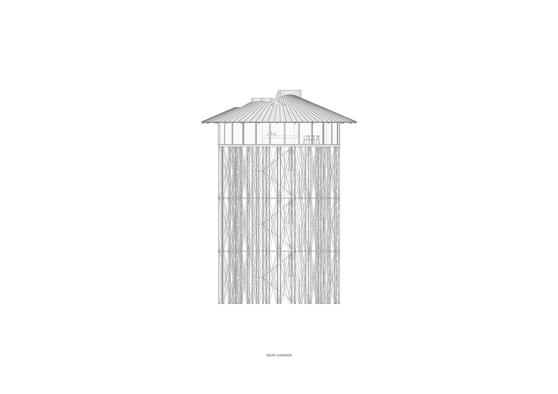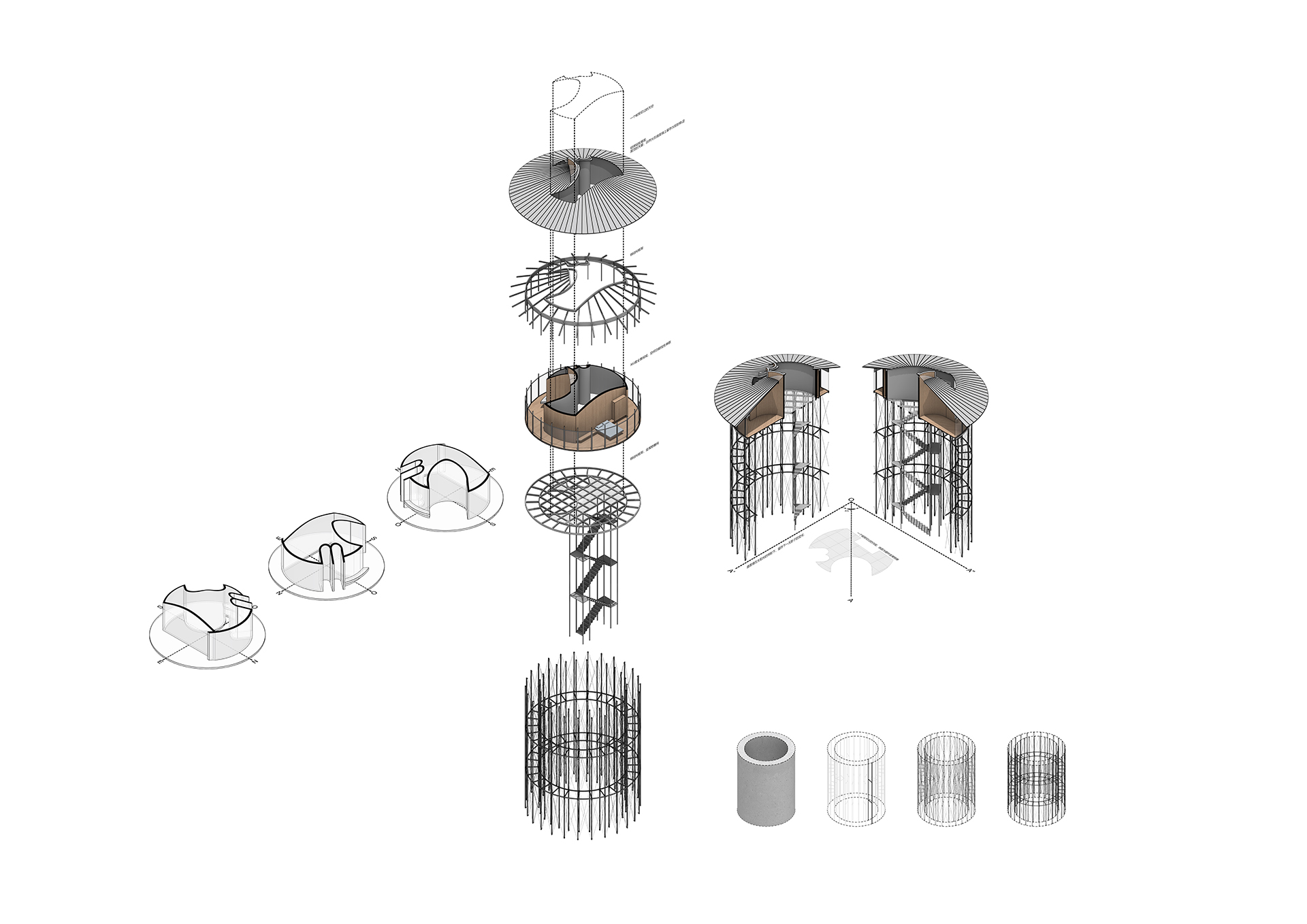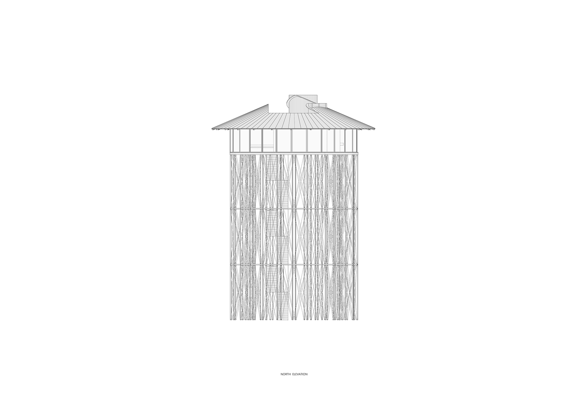 任何居住结构都是不能用于漫步的,除了环形。因为居住结构和家具摆放的原因,人们在空间中往往是被强制转弯的。即使是在一个“口”字形的空间中,也会产生一个90°剧烈转角。空间的“滞”与“流”是互为矛盾的两个终极状态。“滞”是活动的停留。“流”是不加思索的行走。建筑的外部呈现为一个标准的圆形,带来了一圈又一圈周而复始没有尽头的行走。因为环形连续的玻璃窗,在行走中带来了360°的全景视野。这既是“流”。在环形路径的内侧,生长出形态各异的功能空间,如茶室,卧室,淋浴间......人们在此停留,这既是“滞”。建筑被一组纤细的钢架支撑起来的,钢架整体 呈现为环形,和建筑的环形相对应。楼梯置于建筑的中央,在随着楼梯转弯向上的过程中透过纤细的钢架和拉索眺望,仿佛在穿越一片竹林。楼梯的终点是一个内部的平台,四周封闭,唯有抬头可以看见被屋檐剪切后的天空,地面是金属格栅,可以看见来时攀爬过的楼梯。这个平台由于被内部不同空间形态的占据,形成一个边界特殊的内院。