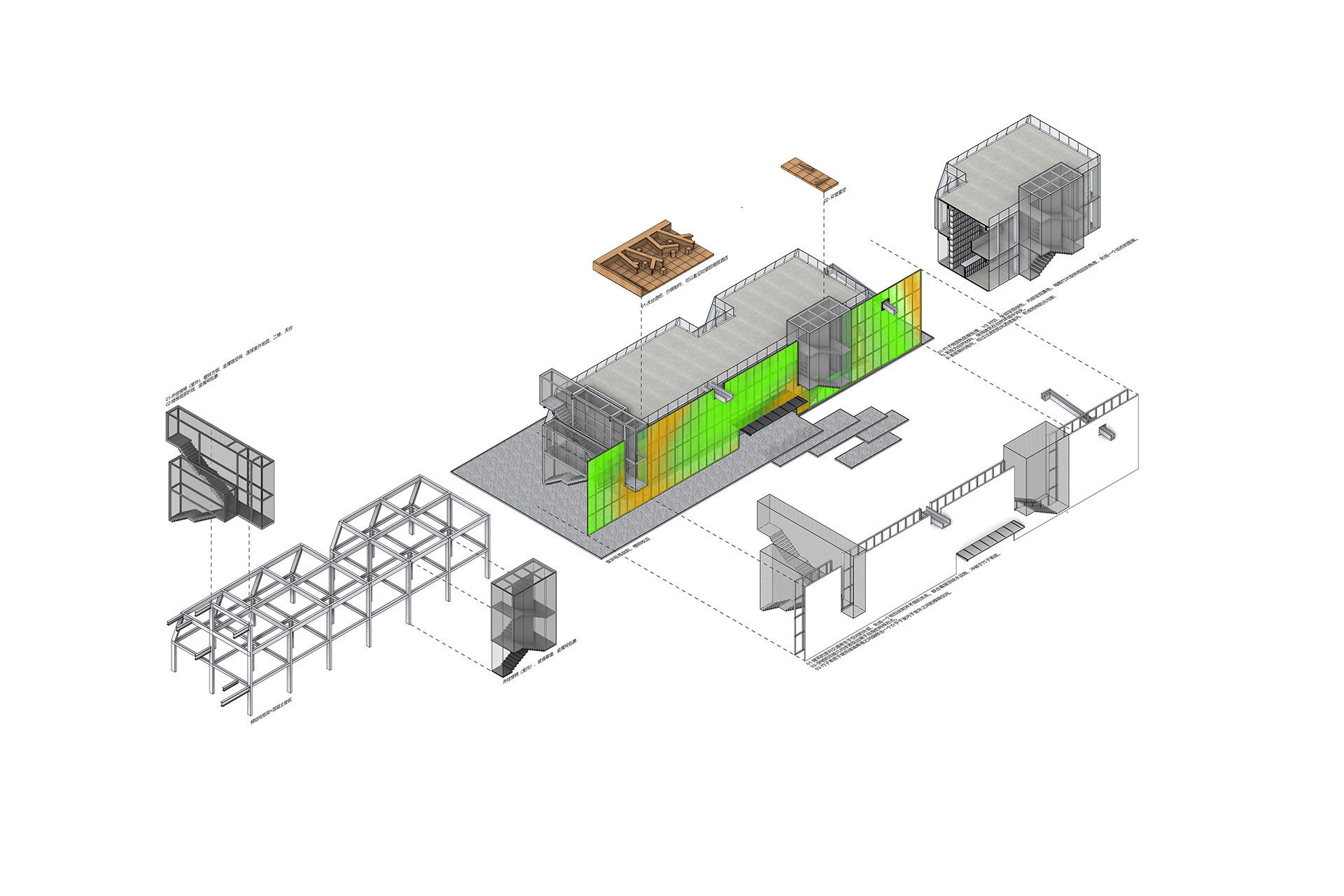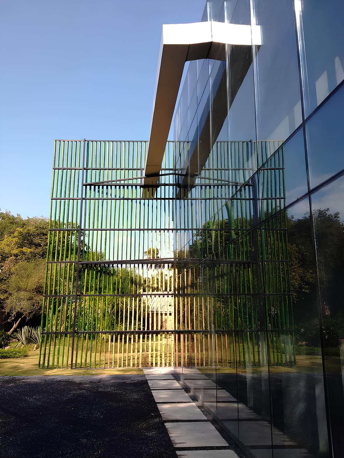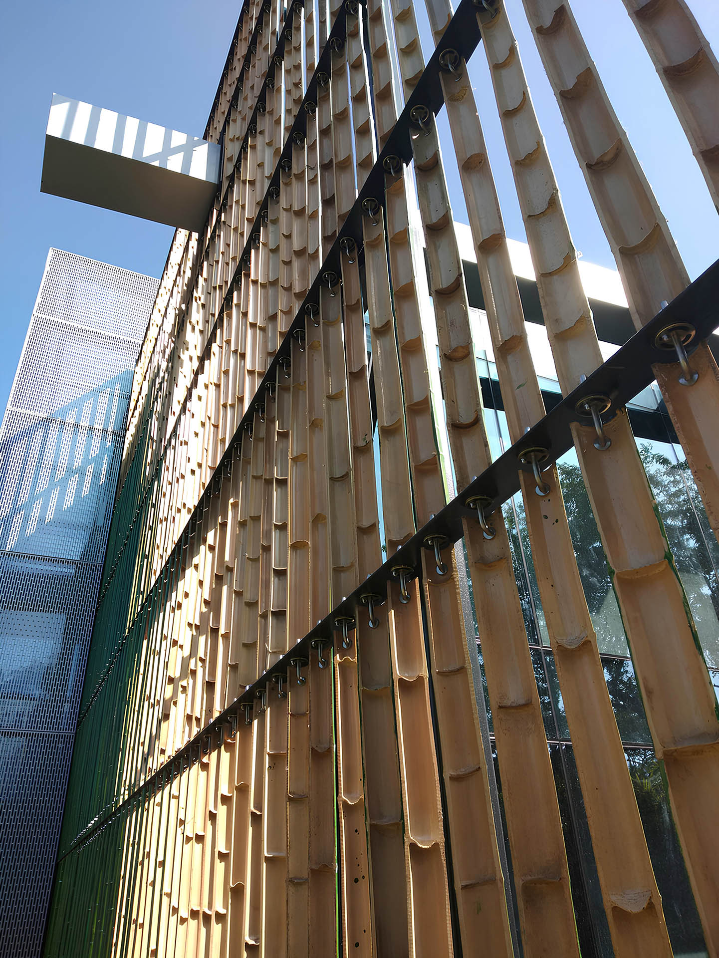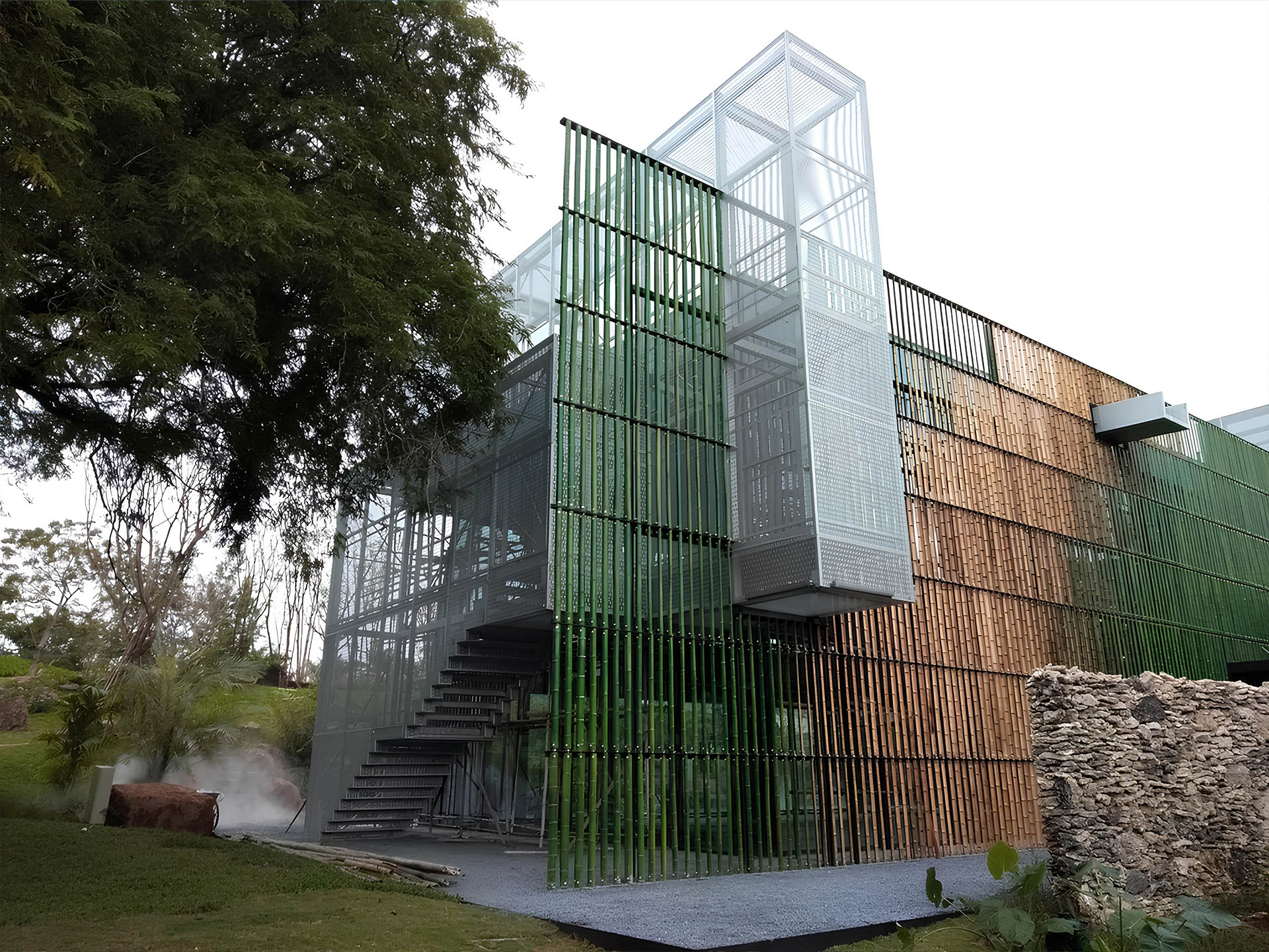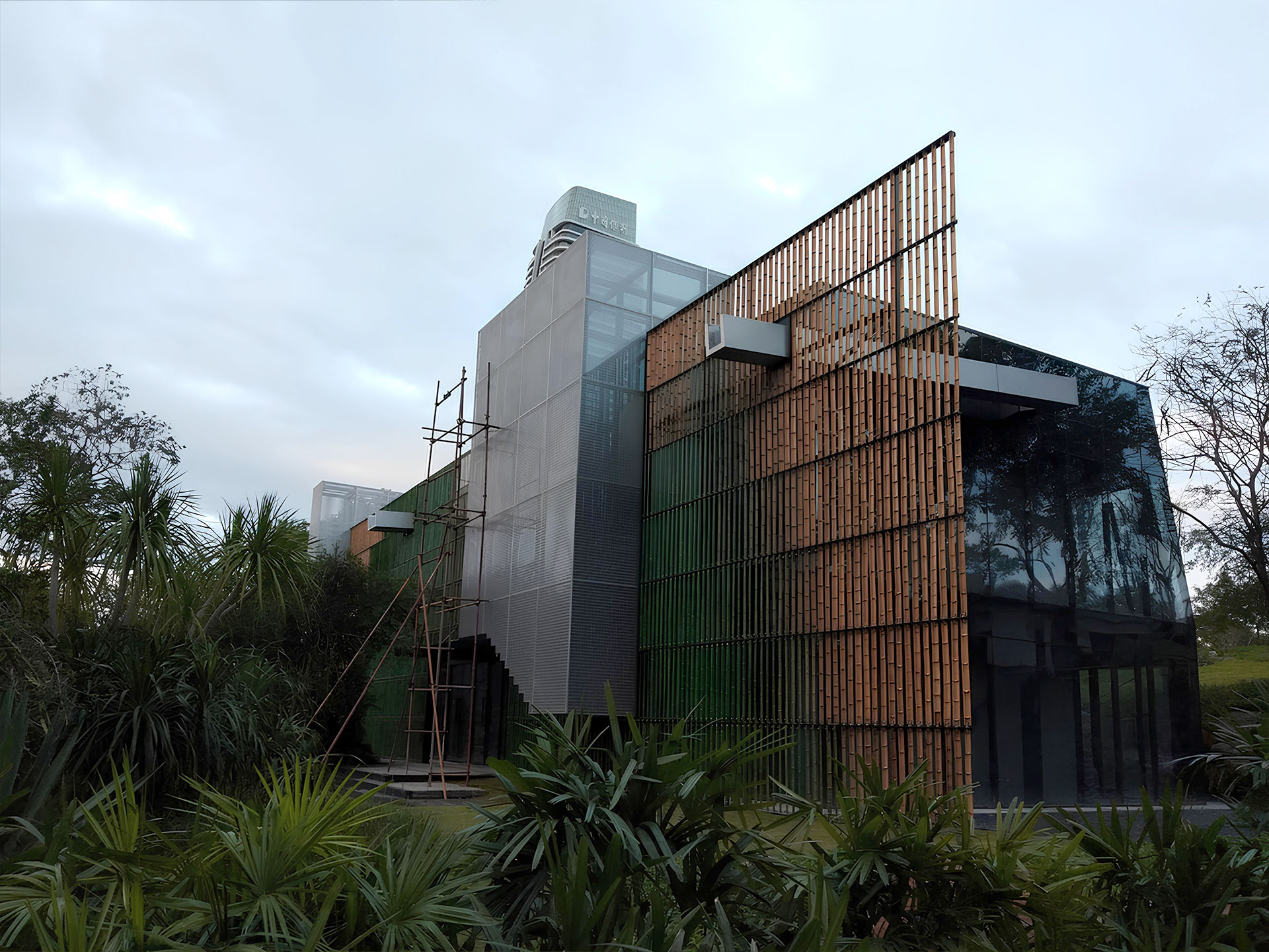 中国最密集的奢华酒店聚集地必是三亚海棠湾,仅仅一条马路之隔,竟然遗落着一个历史村落,这里植被繁茂,房子是珊瑚石建造的,只需稍微的仰望,就会看见树梢上如海市蜃楼般的现代酒店建筑群。在这里保利为世界书局建了一个可以阅读,就餐的建筑。在这样优美的自然环境下,任何一个巨大体量的置入都是对环境极其粗鲁的入侵。为了让这个“不得不”的建筑一方面融入环境,另一方面又能保持其自身存在,唯一的方式就是主动的“自我消失”。建筑是一个可以被任意开敞的玻璃盒子,它在反射周边的绿色,即使在高出树梢的顶部,也将玻璃进行一定角度的倾斜处理,它在反射天空,融入天空。竹子是一个常常被设计师青睐的材料,但往往停留在其枯萎,干燥,泛黄的状态下,但另一个事实是,在新鲜的竹子被劈开的瞬间,内腔呈现的黄色和外皮呈现的绿色相映成趣。设计师和工匠一起尝试了很多办法,最终保持住这样的色彩状态,南侧广场的立面,就是用这个竹子材料编织而成的。将这个竹片均匀的排列在钢架上,竹片两端有可旋转的固定件,竹子可以任意的调整使其呈现绿色或者黄色,最终通过秩序化的旋转,几千棵竹片共同呈现出一个动态感的图案。身体的移动伴随着视角的变化,使由竹片旋转组成的立面形态整体渐变,在自然树木的背景下,这个立面消隐了建筑的体量,却增强了建筑的存在,同时,这个表皮的另一个作用是过滤掉南侧带来的阳光炙烤,表皮和建筑的玻璃立面保持着可以通行的距离,人们穿行在忽明忽暗的光影之间。常常被忽视的交通空间,排水口充满锋芒的突破表皮,在表皮背景与阳光的衬托下显得过于闪亮。它是如此的被人喜爱,曾经被很多恋人选为结婚照的拍摄地,在其还未完全竣工的时候,巴基斯坦总理肖卡特·阿齐兹首选在此做了新书《From Banking to the Thorny World of Politics》的发布。